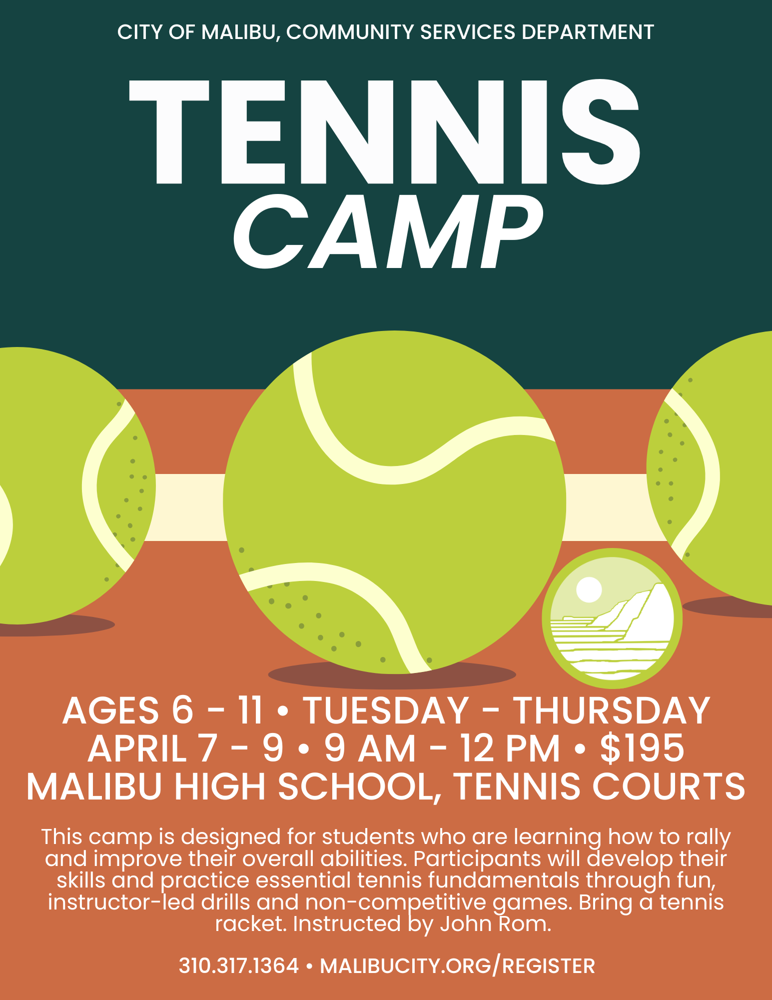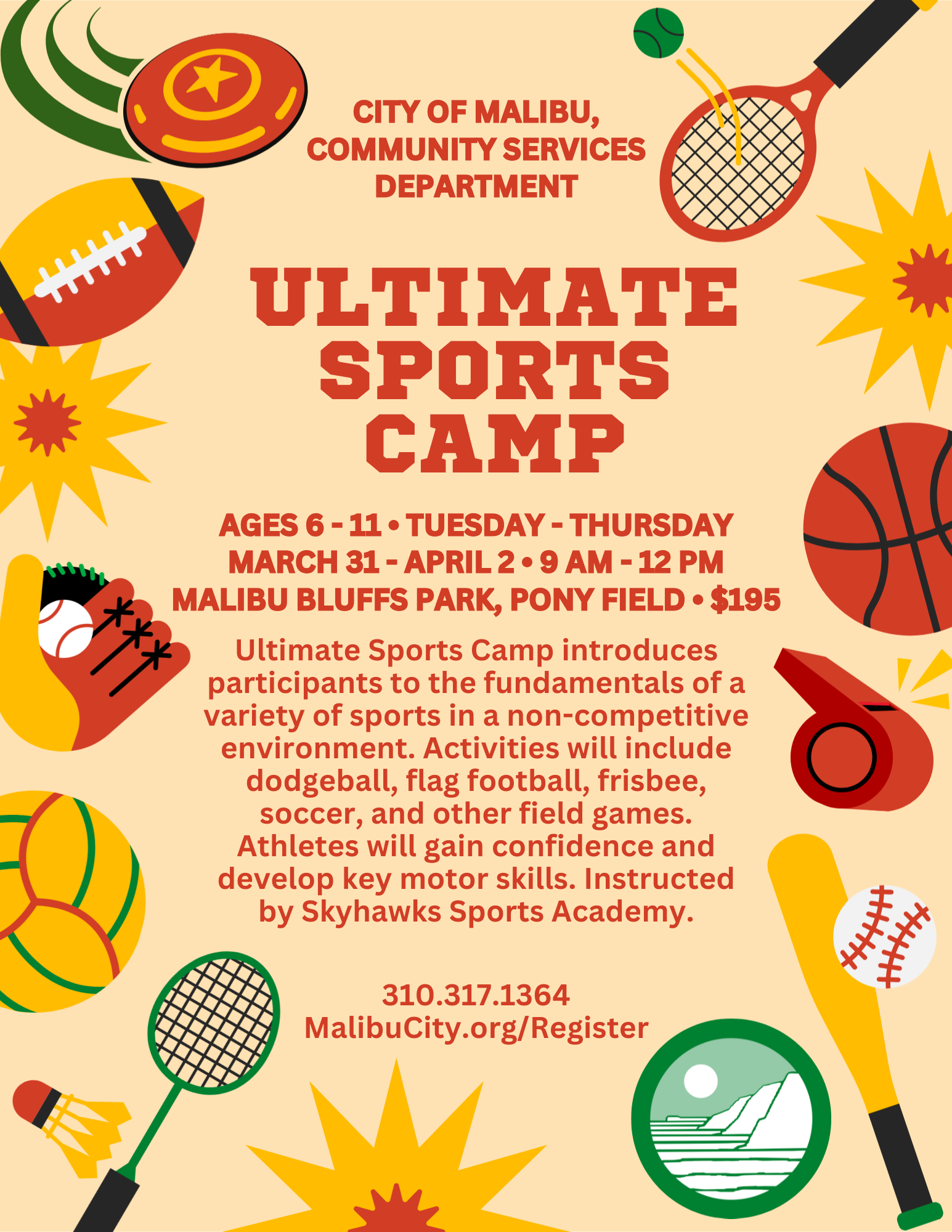 The City of Malibu offers sports and enrichment camps during winter and spring breaks, as well as the summer months. Sports camps offered by the Department include baseball, basketball, flag football, pickleball, skateboarding, soccer, softball, surf, tennis, and volleyball. In addition to athletic programming, the City offers enrichment camps for children, including art, animation, film, improv theater, engineering, music, marine biology, nature and science, and technology.